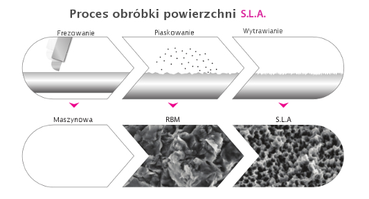 Powierzchnia typu SLA otrzymywana jest poprzez piaskowanie i wytrawianie tytanu. Zabiegi te zwiększają istotnie powierzchnię kontaktu implantu z kością, polepszając siłę jego utrzymania. Dodatkowo tak przygotowana powierzchnia pobudza komórki kości do wzrostu i przyspiesza osseointegrację wszczepu.