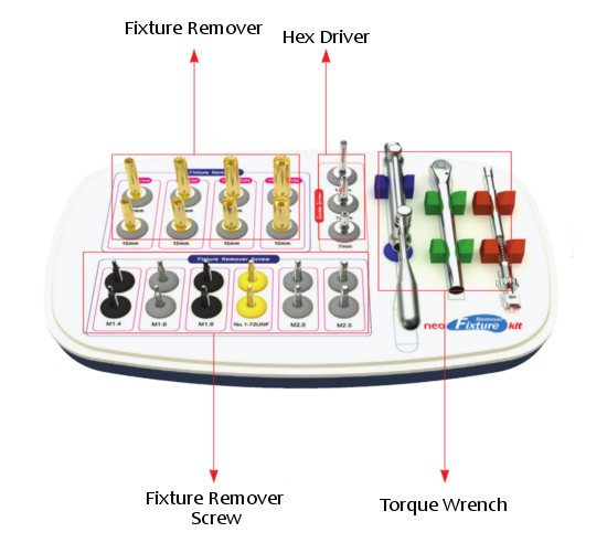 Zestaw Neo Fixture Remover służy do usuwania zintegrowanych implantów w przypadkach gdy implant wprowadzony został ze zbyt wysoką siłą dokręcania lub wystąpiła utrata wcześniej uzyskanej osseointegracji. Zestaw pozwala na wprowadzenie nowego implantu o dokładnie tej samej platformie.
