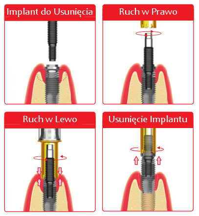 Narzędzie służy do usuwania zintegrowanych implantów poprzez bezpośrednie nałożenie na implant siły odwrotnej do siły dokręcenia po zamontowaniu narzędzia na śrubie Remover Screw.