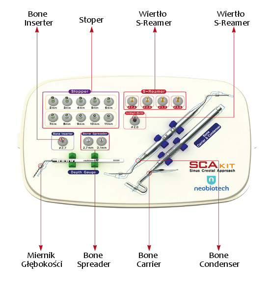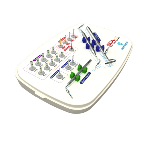 W leczeniu implantologicznym lekarze dentyści najwięcej problemów napotykają w tylnym odcinku wyrostka zębodołowego szczęki (szczególnie przy całkowitym bezzębiu), gdzie często występuje niewystarczająca ilość i gęstość kości. Jedną z bardziej standardowych metod jest podniesienie dna zatoki szczękowej metodą zamkniętą (z użyciem osteotomów). Zaletą metody zamkniętej jest mniejsza inwazyjność, szybszy czas gojenia i możliwość wprowadzenia implantów podczas tego samego zabiegu. Zestaw SCA Kit pozwala na nawiercenie warstwy korowej bez ryzyka uszkodzenia błony śluzowej dna zatoki szczękowej. Zestaw służy do podniesienia dna zatoki w kierunku wierzchołka w celu utworzenia wolnej przestrzeni i przebicia blaszki zbitej dna zatoki. Zestaw SCA pozwala na szybkie nawiercenie kości przy prędkości 800~1,200 rpm a konstrukcja narzędzi pozwala na skuteczną i bezpieczną aplikację biomateriału w zatoce szczękowej. Dzięki stoperom umieszczonym na wiertłach możliwa jest precyzyjna kontrola głębokości preparacji bez ryzyka uszkodzenia błony śluzowej.