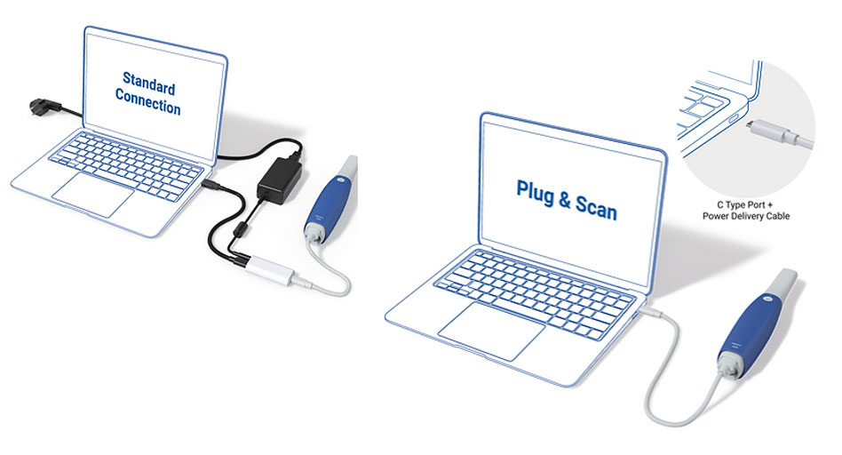 Medit i600 można podłączyć bezpośrednio do komputera za pomocą tylko jednego kabla. Nie potrzeba wielu kabli i koncentratorów!